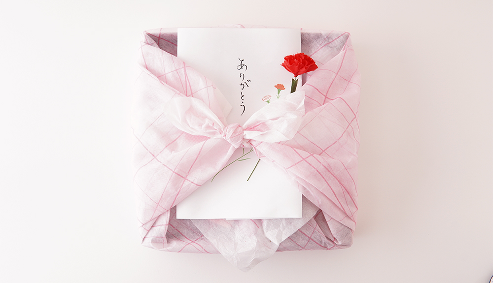 母の日専用の風呂敷(不織布)でお包みし、 プチカーネーションとメッセージ、そして「ありがとう」