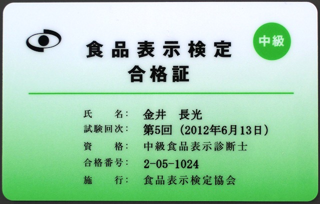 中級食品表示診断士の資格を頂きました。