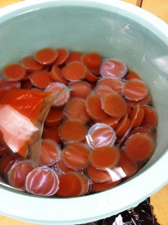 - 朝恋トマトゼリーを釜にて熱を入れリコピンが3倍に・・・・・炊き上がればカップに入れてシーラー(手作業で頑張ってます)